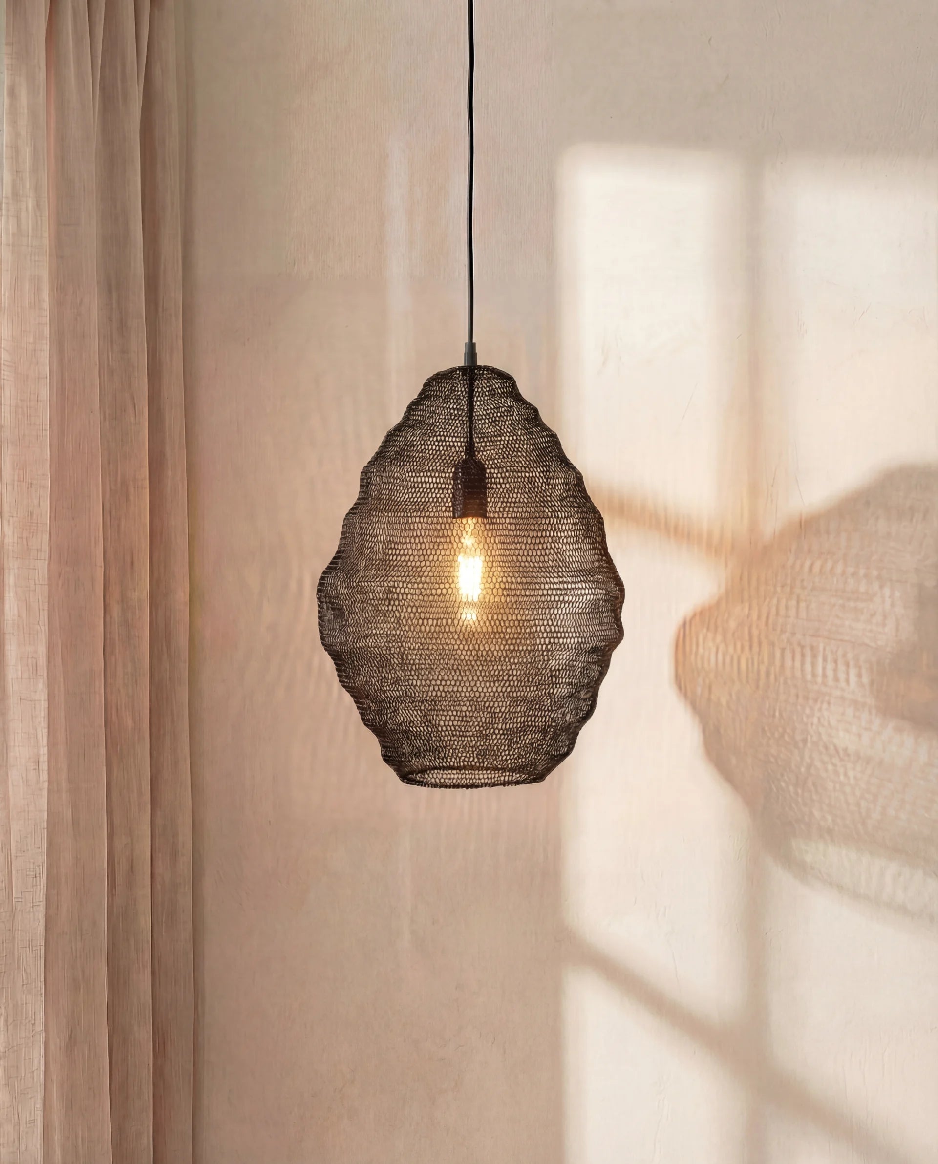 The Kura Black Wire Lamp Shade is formed from fine black metal wire, shaped into an open, textured form that softens light and casts gentle shadow. Designed to feel calm and understated rather than industrial. Made in small batches and available in limited quantities.