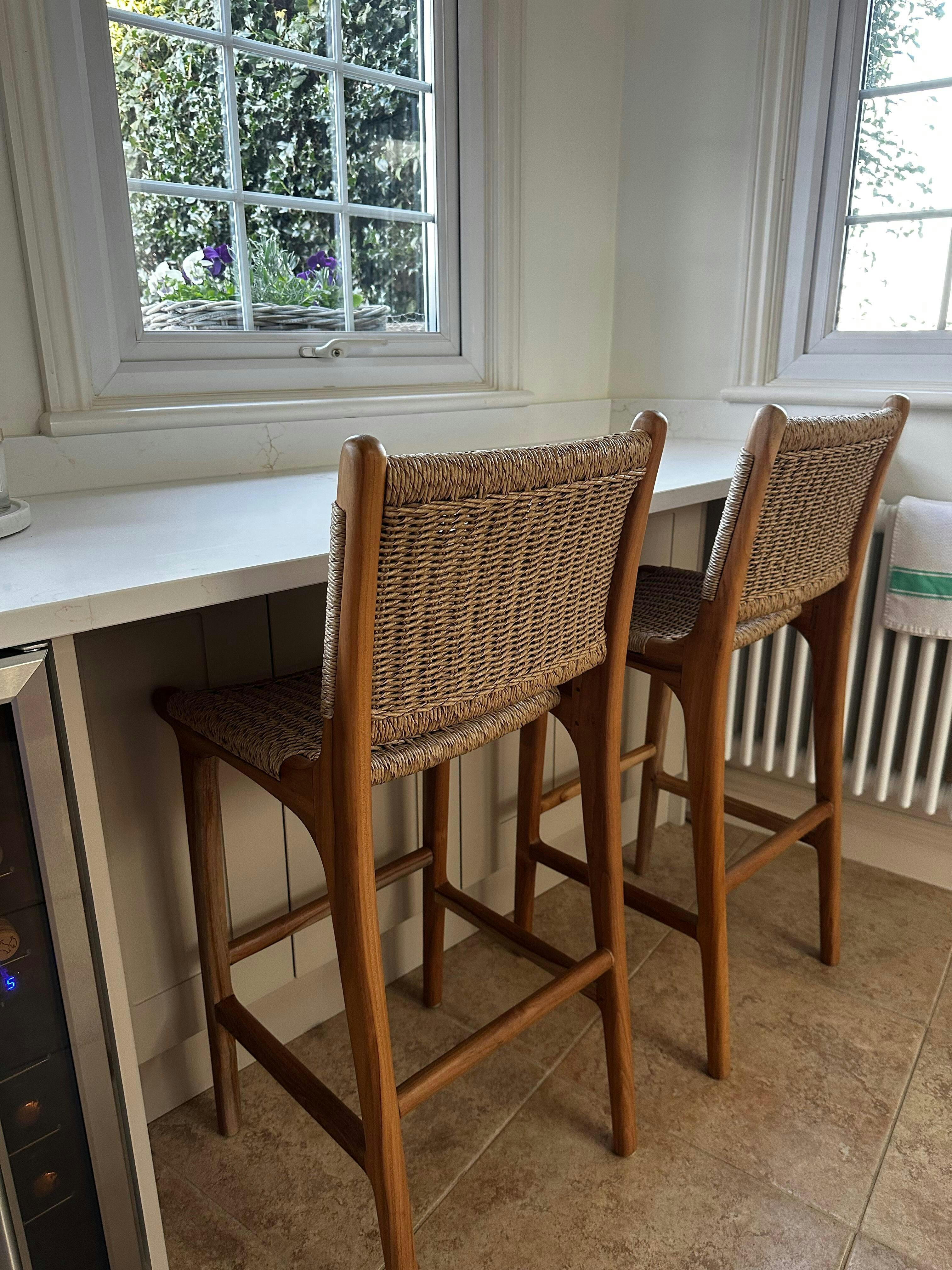 The Zara Bar Stool is crafted by hand using a strong rattan blend, chosen for its durability and shape-holding structure. Each cord is tightly wrapped around a solid teak frame by skilled artisans using traditional techniques. Once complete, the stool is lightly varnished to seal and protect the surface. Unlike natural fibres, this blend won’t sag or discolour over time, making it ideal for busy homes. Every stool is a balance of modern practicality and traditional craft, built to be lived with and appreciated for years.