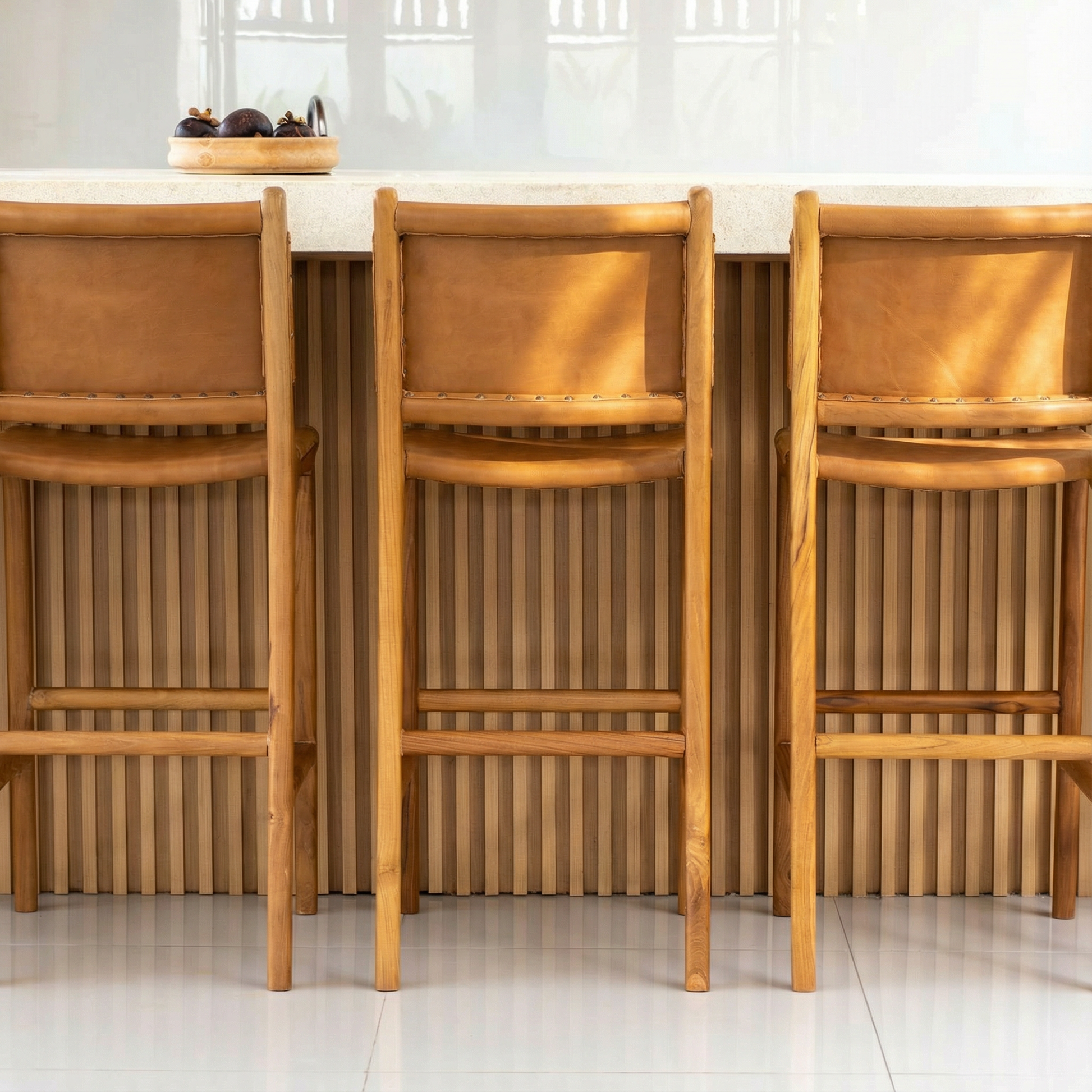 Each stool takes over two weeks to make, using teak wood that has been kiln dried to reduce moisture and ensure long-lasting strength. The frame is then finished with a natural leather chosen for its flexibility, comfort and ability to maintain its shape over time. The result is a stool that offers gentle spring and lasting comfort, even with daily use. With a seat height of 65cm, it fits standard UK counter heights perfectly. Made slowly in small batches and never mass produced, each stool is a rare piece of craftsmanship built to be beautiful, practical, and made to last.