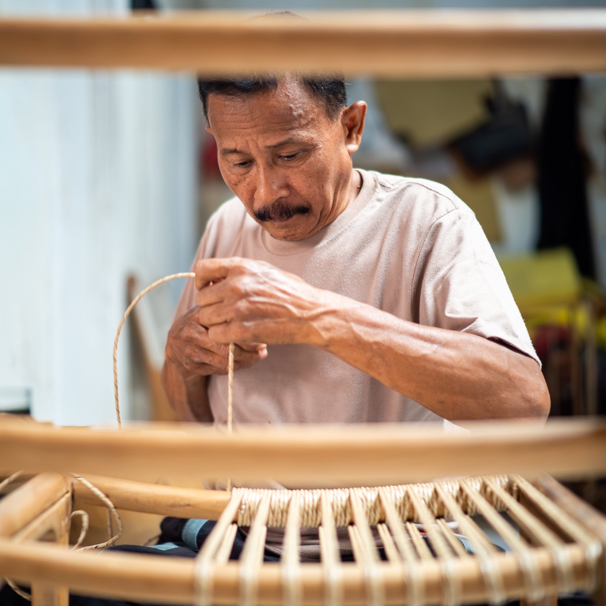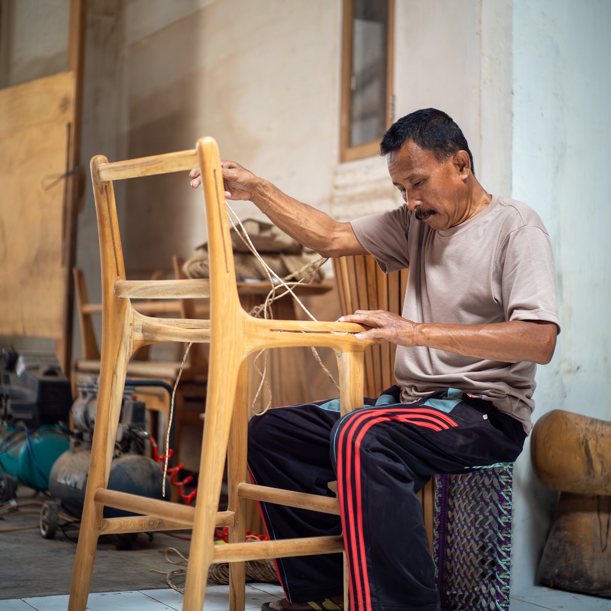 Each teak frame is first kiln-dried to remove moisture and ensure lasting strength. The wood is then milled, sanded, and assembled before the base and backrest are handwoven with rattan in a precise cross-stitch pattern that gives a gentle flex for comfort. Finally, the legs are levelled by hand and the frame is sealed with a light varnish that protects against stains while enhancing the natural grain of the teak.